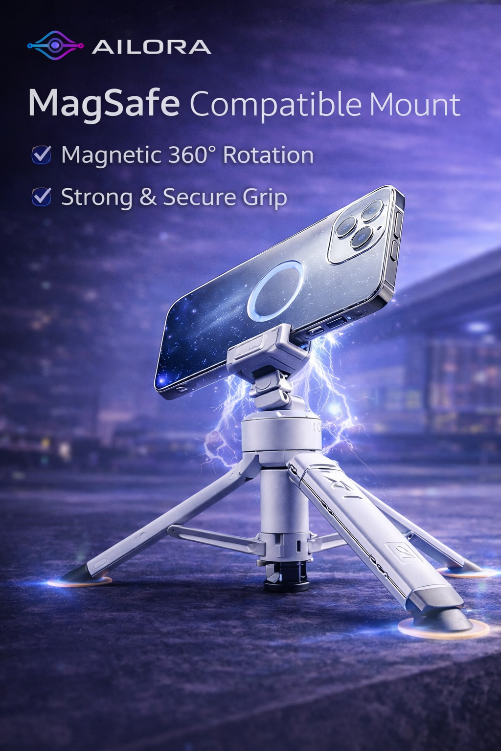 CLIPLOOK MagSafe™ tripod securely snaps your phone into perfect alignment with a single touch. Powerful built-in N52 magnets ensure a firm and stable hold, keeping your device safe and steady — whether you're shooting videos, taking selfies, or on the move. Package includes: 1 metal ring.